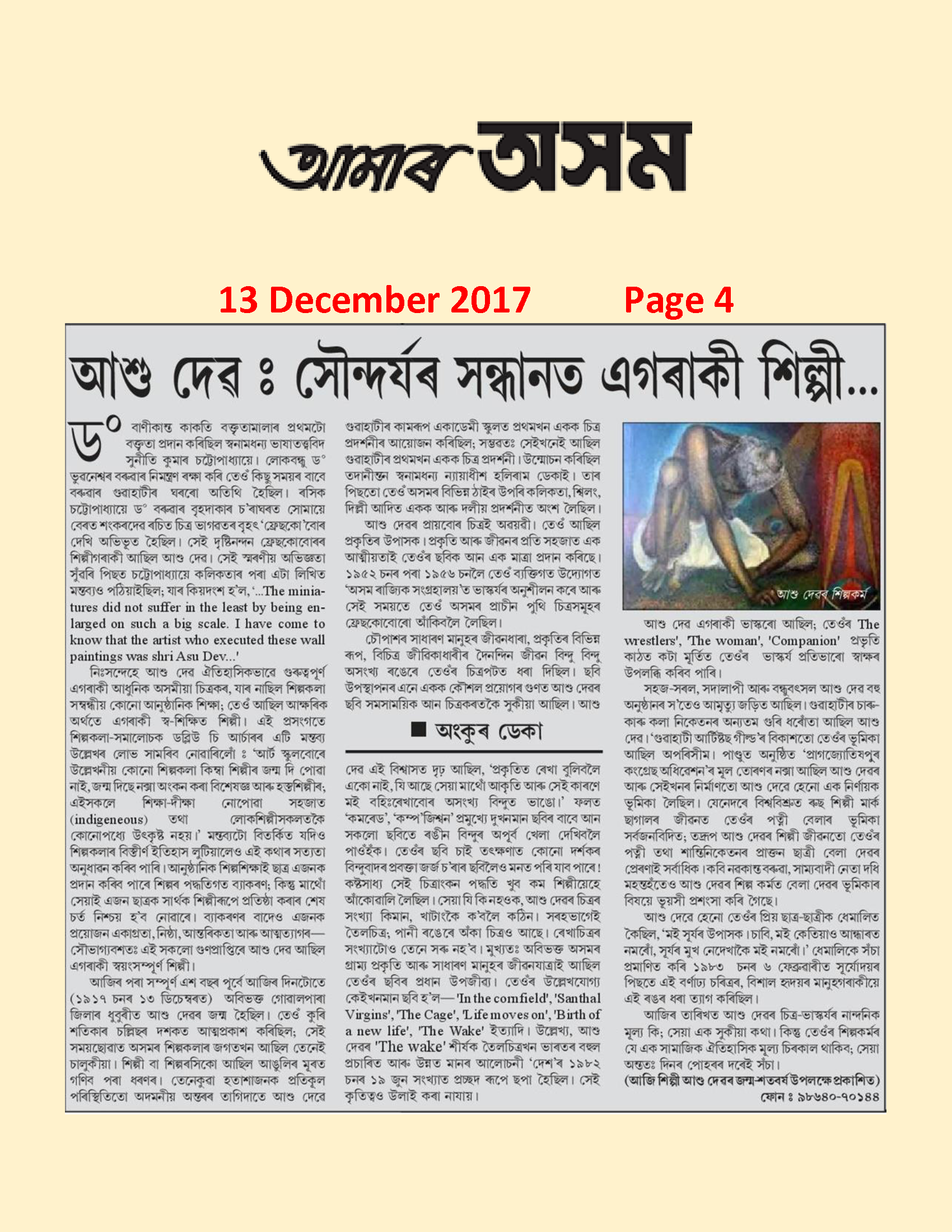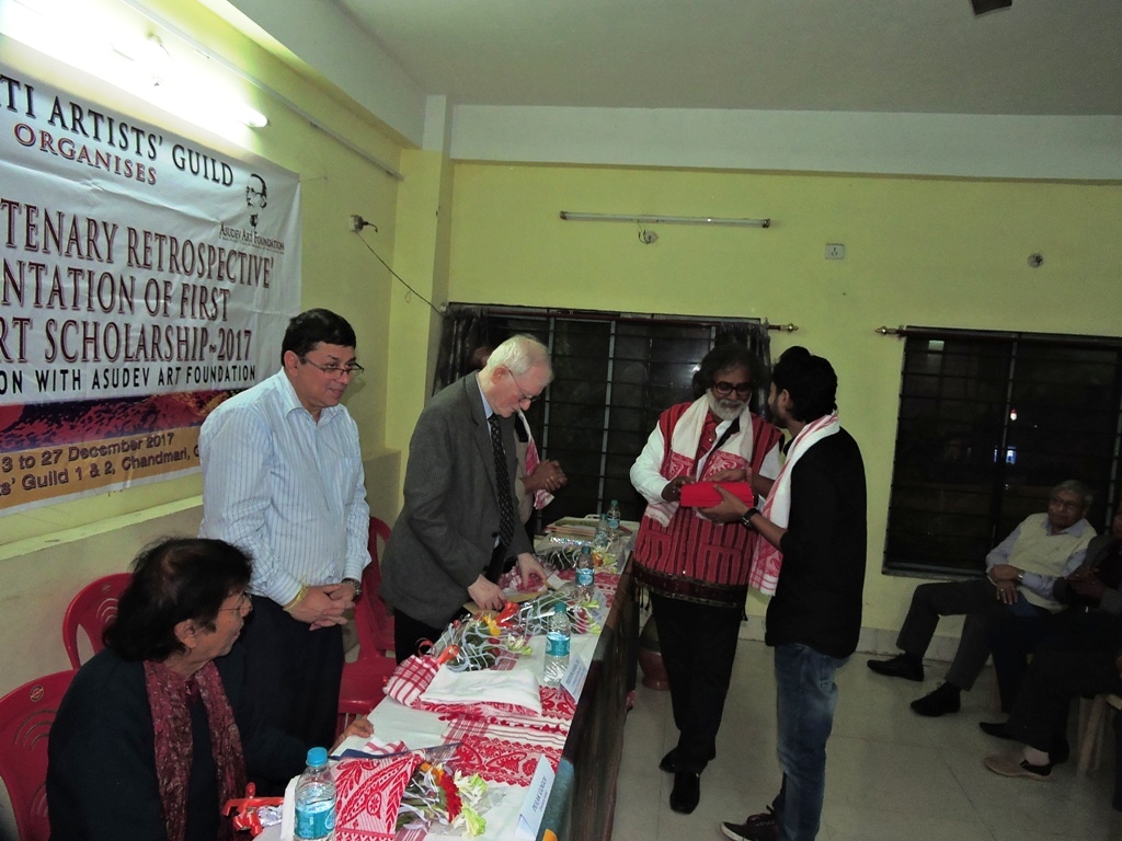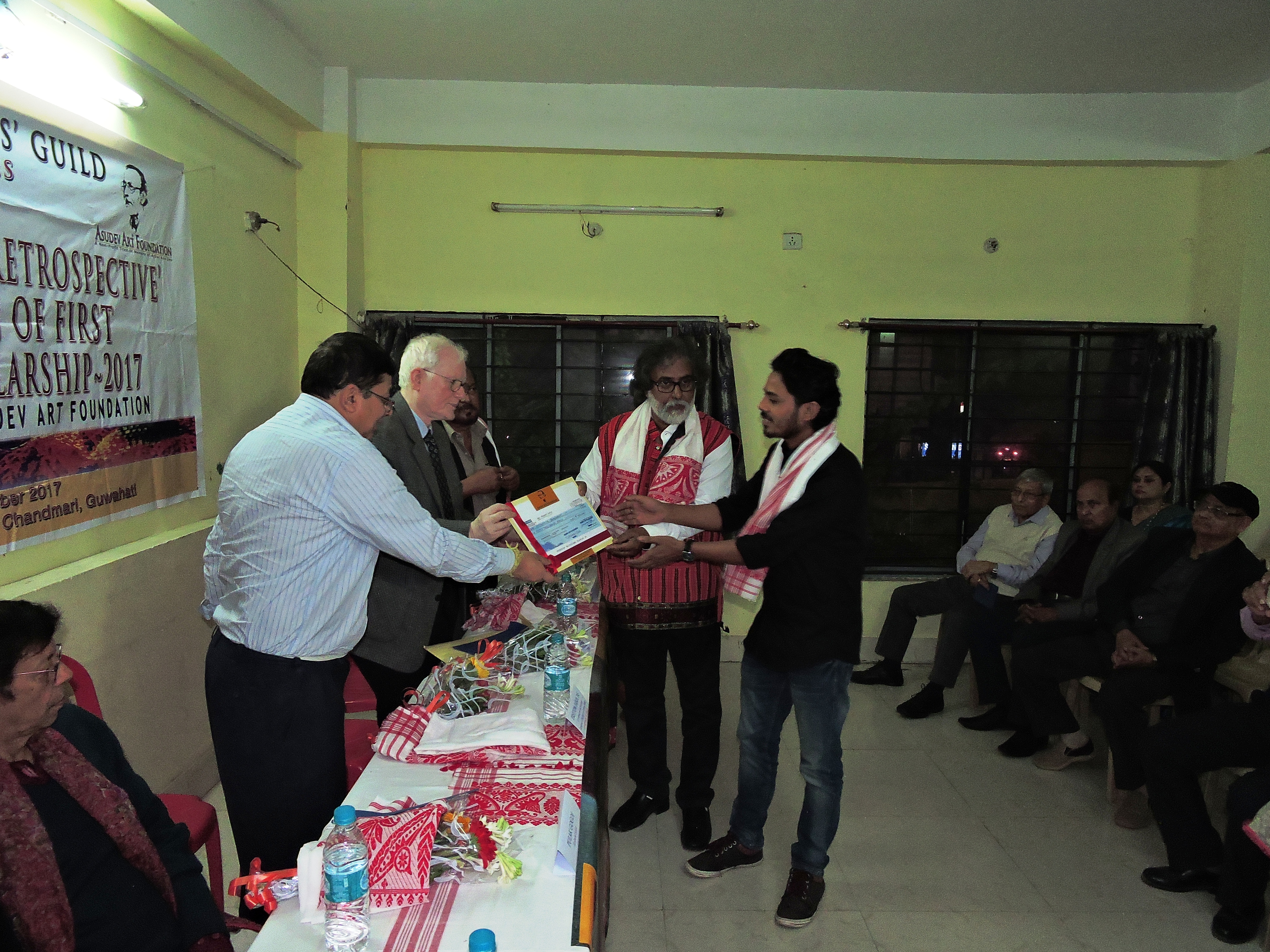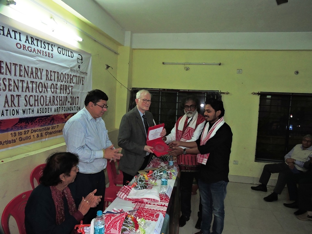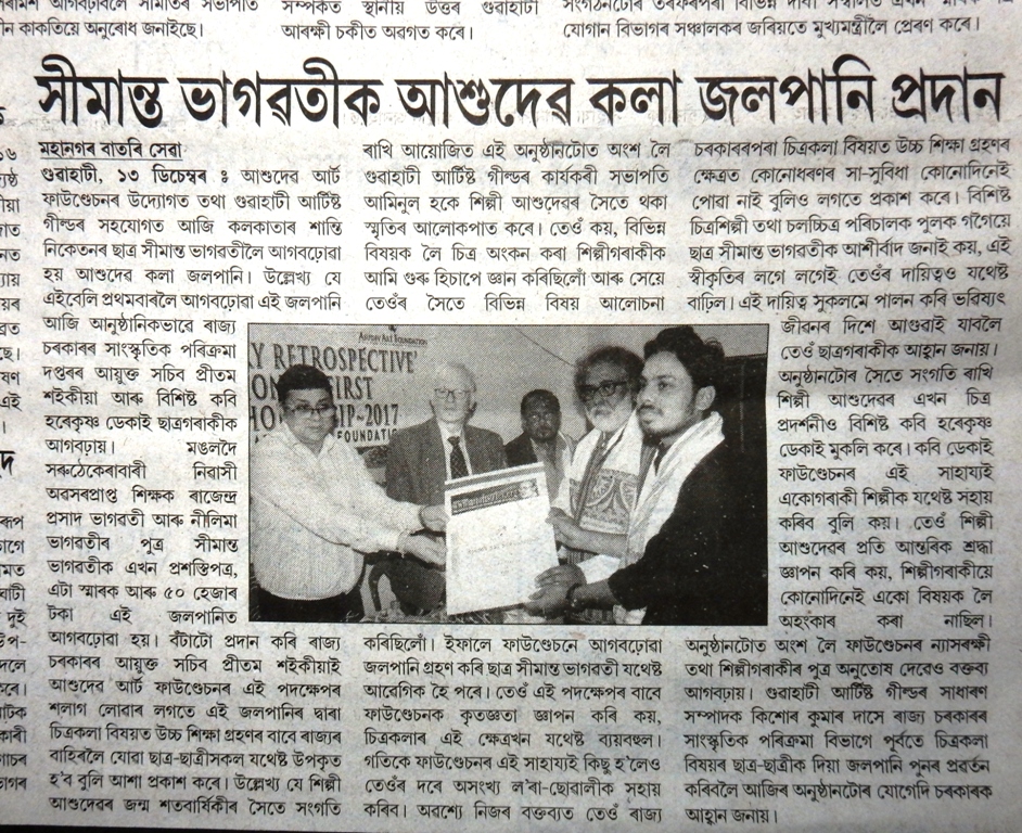 - Seemanta Bhagawati receiving the First Asu Dev Art Scholarship 2017, on 13 December 2017 at Gauhati Artists’ Guild. members. Photographed by Prabhakar De, Guwahati Assam India