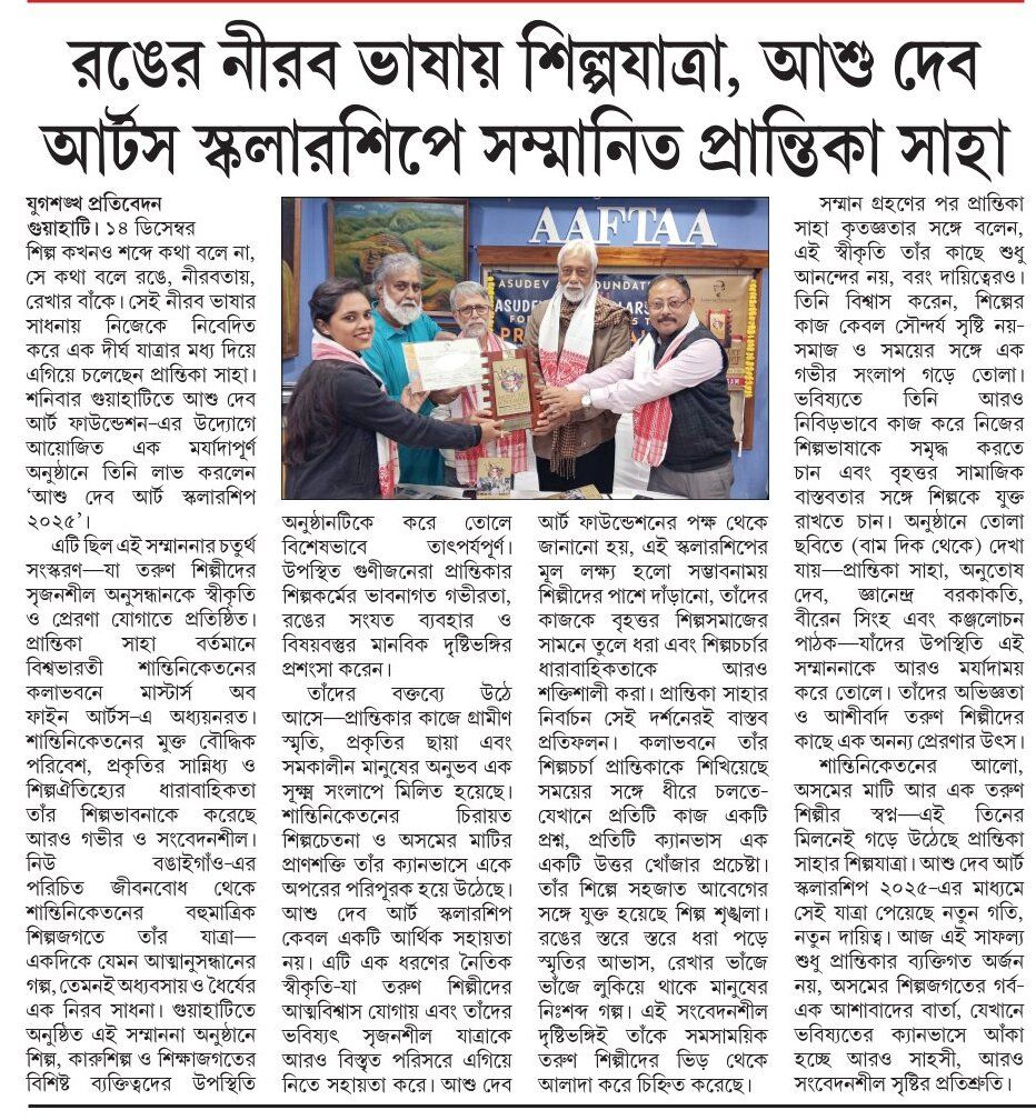 The fourth ‘ASUDEV ART SCHOLARSHIP’ initiated by ASUDEV ART FOUNDATION (A non-profit family trust in memory of pioneer Assam Artist ASUDEV) will be awarded to MISS PRANTIKA SAHA, presently pursuing her Masters in Fine Arts in the Department of Design (Ceramics & Glass) at Kala Bhavana, Visva-Bharati, Santiniketan. She had also completed her Bachelors in Fine Arts, from the same department & University during 2024-2025. She had her schooling from PM SHRI Kendriya Vidyalaya New Bongaigaon.