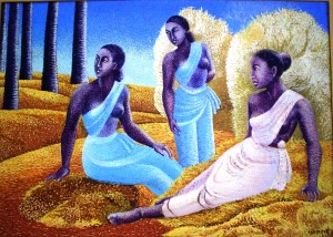 I have seen only two paintings (Comrade and the other entitled Composition) which do not have that granular effect. In Comrade Asu Dev uses oil with a translucent effect and Composition is a composition with squares and trapeziums, bordering on the abstract. Barring these, most of his canvases present his characteristic texture, the ‘dots’ painstakingly worked into them. Colour tones are created by the dots and not by gradual shading. If Asu Dev had any link with Seurat’s experiments, theoretically at least were confined to colour tones only. Asu Dev’s dots were a substitute for strokes of brush. So he created effects of movement, even aerial movement (see the whirling patch-dots in Harijan) with his technique.