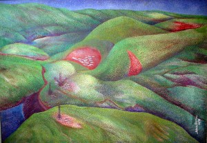 In my own way, judging from the prints I have seen, there is a striking similarity of total effect of the Greek mosaics of the Byzantine period with Asu Dev’s almost proverbial dots. They are akin in dedication and subtle execution. Like the bits of coloured stones which the Greek mosaic makers used, Asu Dev made use of the various pigments with the tip of his brush. The mosaic makers did that labour of love because of their dedication to the church and the Christ; Asu Dev too, took similar pains to convey his concern for art, life and nature. It’s true, they appear a bit stylized, but what art is not? In his landscapes, the dots appear to be more subdued (Birth of a new life), creating an effect of tapestry. One suddenly recalls, Asu Dev was once professionally a textile designer. Has it anything to do with the cellular quality of his canvasses, one wonders. And again did Beladi (Mrs Asu Dev, who had shared many of her husband’s exhibitions) with her training at ornamental art at Santiniketan indirectly made Asu Dev feel the power of the dots which Beladi uses in her Alpana-like designs? One can guess and leave the matter at that.